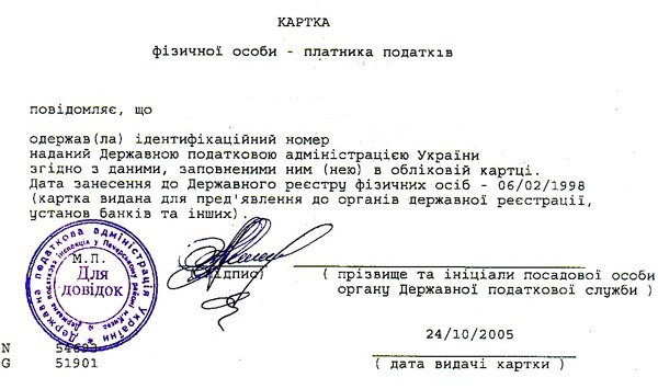 ► Копія довідки про присвоєння реєстраційного номера облікової картки платника податків або копія відповідної відмітки в паспорті (для осіб, які через свої релігійні переконання відмовились від прийняття реєстраційного номера облікової картки платника податків та офіційно повідомили про це відповідний контролюючийорган і мають відмітку в паспорті).